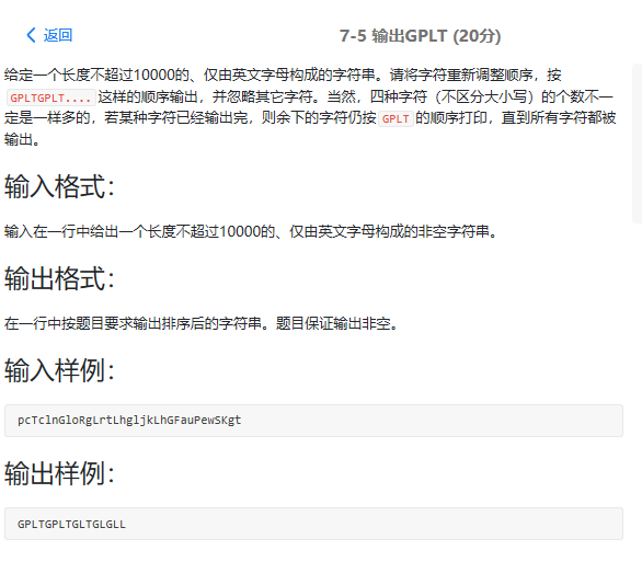 1 #include<iostream> 2 #include<cstdio> 3 #include<cmath> 4 #include<cstring> 5 #include<algorithm> 6 using namespace std; 7 const int maxx=1e5+2; 8 int main(){ 9 char a[maxx]; 10 scanf("%s",&a); 11 int n=strlen(a); 12 int s[4]={0}; 13 for(int i=0;i<n;i++){ 14 if(a[i]=='G'||a[i]=='g'){ 15 s[0]++; 16 }else if(a[i]=='p'||a[i]=='P'){ 17 s[1]++; 18 }else if(a[i]=='L'||a[i]=='l'){ 19 s[2]++; 20 }else if(a[i]=='T'||a[i]=='t'){ 21 s[3]++; 22 } 23 } 24 while(!(s[0]==0&&s[1]==0&&s[2]==0&&s[3]==0)){ 25 if(s[0]>0){ 26 printf("G"); 27 s[0]--; 28 } 29 if(s[1]>0){ 30 printf("P"); 31 s[1]--; 32 } 33 if(s[2]>0){ 34 printf("L"); 35 s[2]--; 36 } 37 if(s[3]>0){ 38 printf("T"); 39 s[3]--; 40 } 41 } 42 43 }