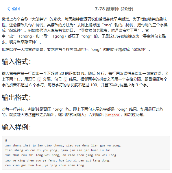 感受:这个题一开始读的时候没有读仔细,以为是在'ong'的地方改成‘敲笨钟’,就直接全部答案错误,后来发现是这的问题,读题一定得注意细节挖掘一些可以wa掉的点