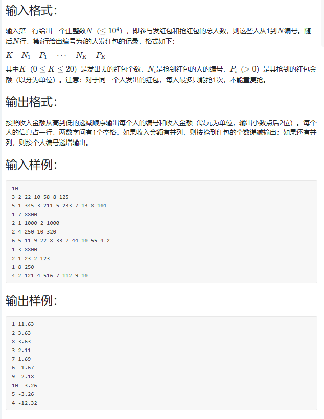 1 #include<iostream> 2 #include<cstdio> 3 #include<cmath> 4 #include<cstring> 5 #include<algorithm> 6 using namespace std; 7 const int maxx=1e5+2; 8 struct people{ 9 int num=0; 10 int sum=0; 11 int money; 12 }a[maxx]; 13 bool cmp(people a,people b){ 14 if(a.money>b.money){ 15 return 1; 16 }else if(a.money<b.money){ 17 return 0; 18 }else{ 19 if(a.sum>b.sum){ 20 return 1; 21 }else if(a.sum<b.sum){ 22 return 0; 23 }else{ 24 return a.num<b.num; 25 } 26 } 27 } 28 int main(){ 29 int n; 30 int k; 31 32 scanf("%d",&n); 33 int nn=n; 34 int j=1; 35 while(n--){ 36 int k; 37 scanf("%d",&k); 38 int sum=0; 39 for(int i=0;i<k;i++){ 40 int num; 41 int va; 42 scanf("%d %d",&num,&va); 43 a[num].money+=va; 44 a[num].num=num; 45 sum+=va; 46 a[num].sum++; 47 48 } 49 a[nn-n].money-=sum; 50 } 51 for(int i=1;i<nn+1;i++){ 52 if(a[i].num==0){ 53 a[i].num=i; 54 } 55 } 56 sort(a+1,a+nn+1,cmp); 57 for(int i=1;i<nn+1;i++){ 58 double money; 59 money=a[i].money*0.01; 60 printf("%d %.2f",a[i].num,money); 61 if(i<nn){ 62 printf("\n"); 63 } 64 } 65 }