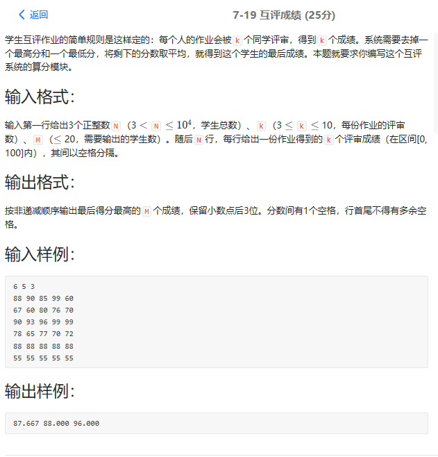 1 #include<iostream> 2 #include<cstdio> 3 #include<cmath> 4 #include<cstring> 5 #include<algorithm> 6 #include<queue> 7 using namespace std; 8 const int maxx=1e5+2; 9 10 int main(){ 11 int n,k,m; 12 scanf("%d %d %d",&n,&k,&m); 13 int nn=n; 14 double a[maxx]={0}; 15 while(nn--){ 16 double sum=0; 17 double minn=1e5,ma=0; 18 for(int i=0;i<k;i++){ 19 double num=0; 20 scanf("%lf",&num); 21 sum+=num; 22 minn=min(minn,num); 23 ma=max(ma,num); 24 } 25 sum-=minn; 26 sum-=ma; 27 a[n-nn-1]=sum*1.0/(k-2); 28 } 29 sort(a,a+n); 30 for(int i=n-m;i<n;i++){ 31 printf("%.3f",a[i]); 32 if(i<n-1){ 33 printf(" "); 34 } 35 } 36 37 }