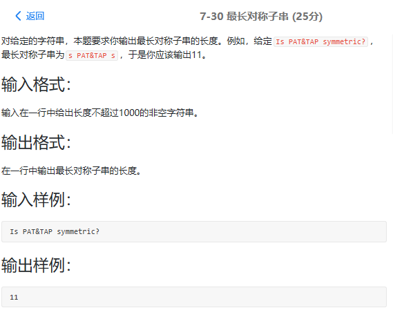 1 #include<iostream> 2 #include<algorithm> 3 #include<cstdio> 4 #include<cmath> 5 #include<cstring> 6 using namespace std; 7 int main(){ 8 string s; 9 getline(cin,s); 10 int n=s.size(); 11 int sum=0; 12 for(int i=0;i<n;i++){ 13 int left=i-1; 14 int right=i+1; 15 int ss=0; 16 while(left>=0&&right<n&&s[left]==s[right]){ 17 ss+=2; 18 left--; 19 right++; 20 } 21 sum=max(sum,ss+1); 22 } 23 for(int i=0;i<n;i++){ 24 int left=i-1; 25 int right=i; 26 int ss=0; 27 while(left>=0&&right<n&&s[left]==s[right]){ 28 ss+=2; 29 left--; 30 right++; 31 } 32 sum=max(sum,ss); 33 } 34 printf("%d\n",sum); 35 36 }