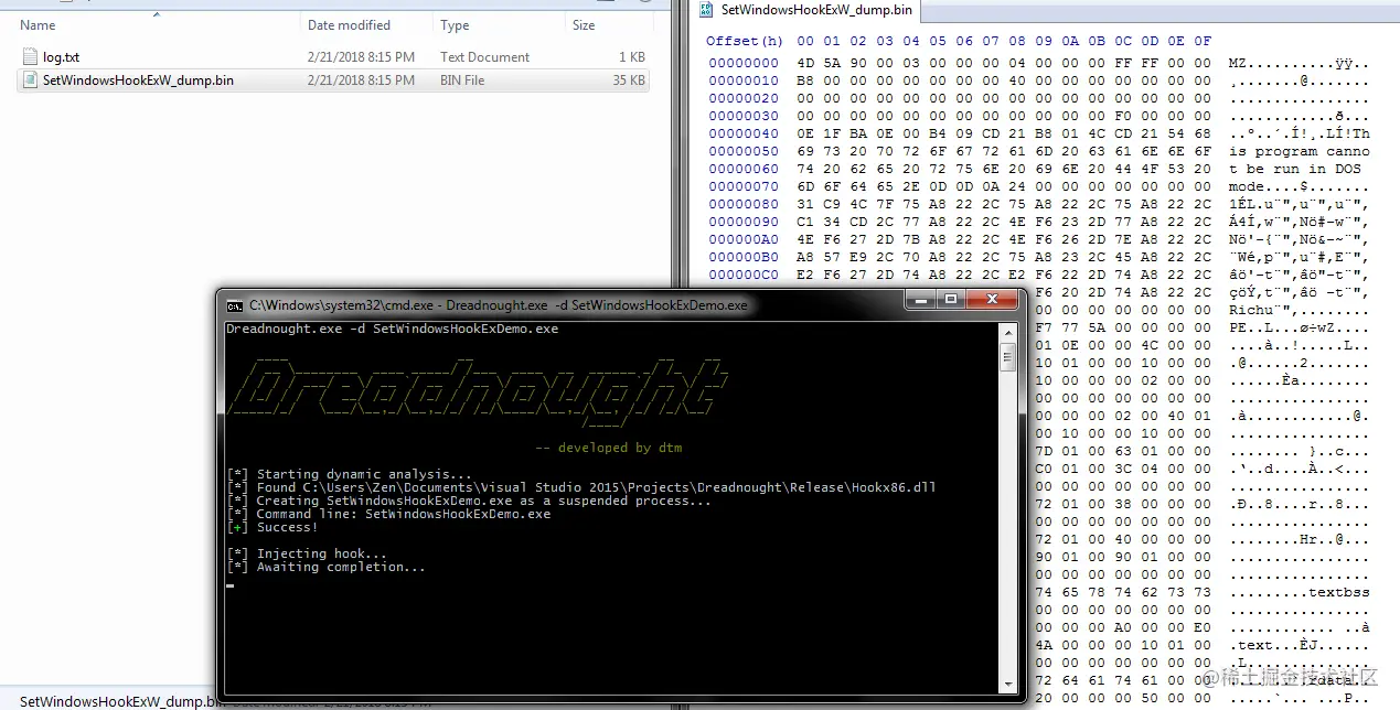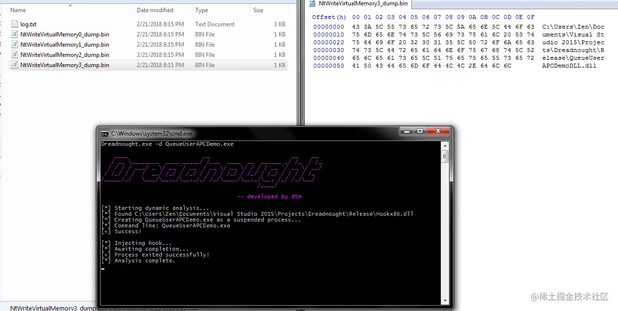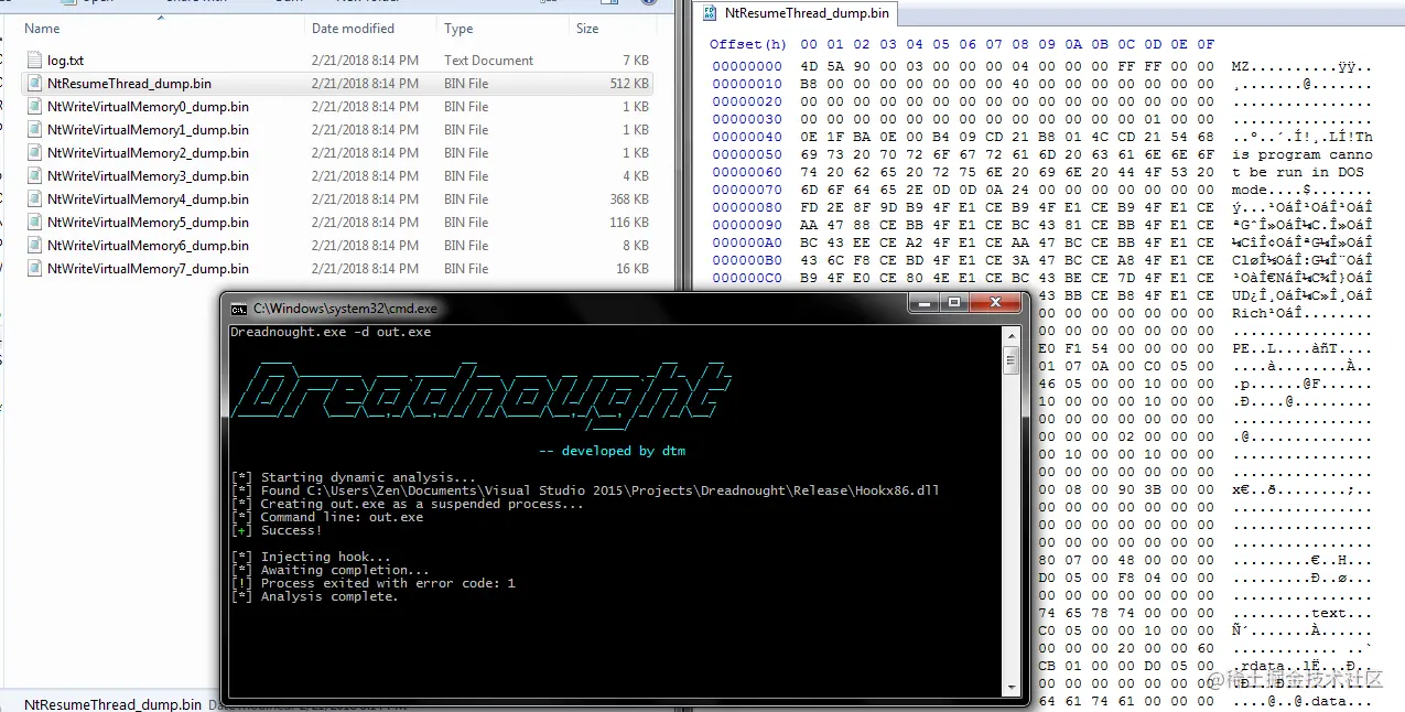 本文旨在让读者对代码注入及其与 WinAPI 的交互具有一定程度的技术理解。此外,在用户领域监控 API 调用的概念也曾被恶意地利用来绕过反病毒检测。下面是本文中有关 Dreadnought 工具在实际的使用情况说明。