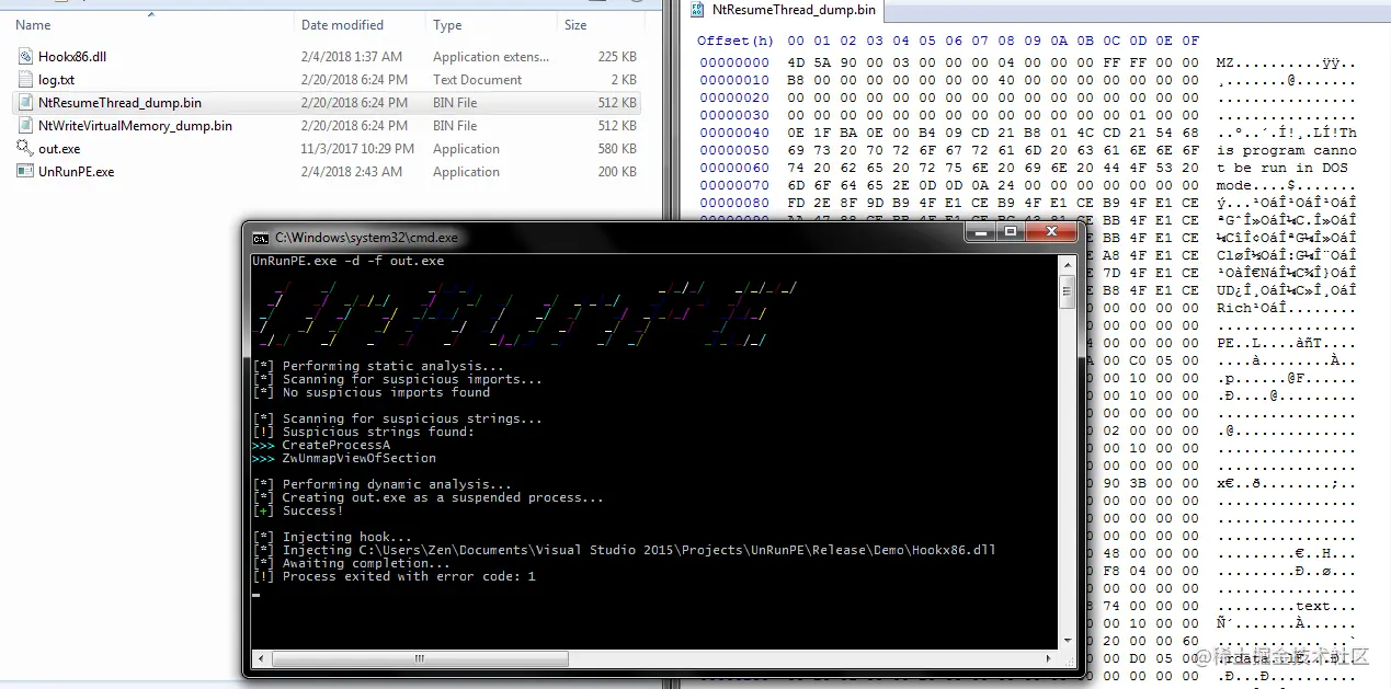UnRunPE 是一个概念验证(Proof of concept,简称 PoC)工具,是为了将 API 监控的理论概念应用到实际操作而编写的。该工具的目的是将选定的可执行文件作为进程创建并挂起,随后将带有钩子函数的 DLL 通过傀儡进程技术(process hollowing)注入到进程中。