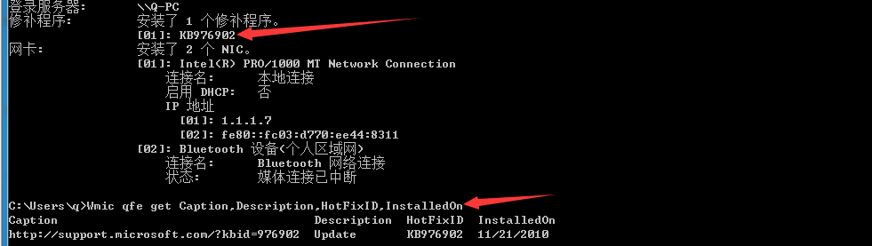wmic qfe get Caption,Description,HotFixID,InstalledOn | findstr /C:"kb3143141" /C:"KB976902"