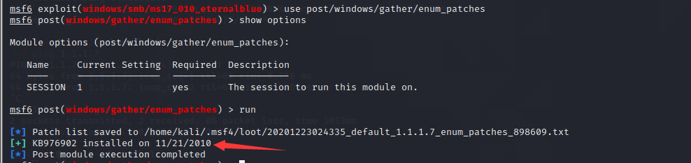 msf6 exploit(windows/smb/ms17_010_eternalblue) > use post/windows/gather/enum_patches