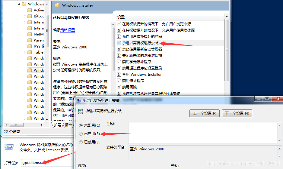 - 组策略——用户配置-——管理模板——Windows组件——Windows Intaller——永远以高特权进行安装:选择启用。