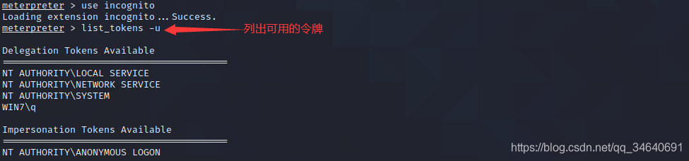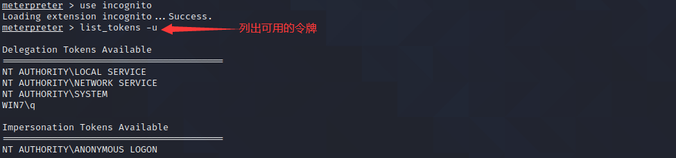 假设已经获得了目标机器的 meterpreter Shell。首先输入“use incognito”命令,然后输人“list_tokens -u”命令,列出可用的令牌