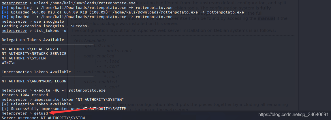 如果目标系统中存在有效的令牌,可以通过Rotten Potato程序快速模拟用户令牌来实现权限的提升。首先输入“use incognito”命令,然后输入“list_tokens -u”命令,列出可用的令牌