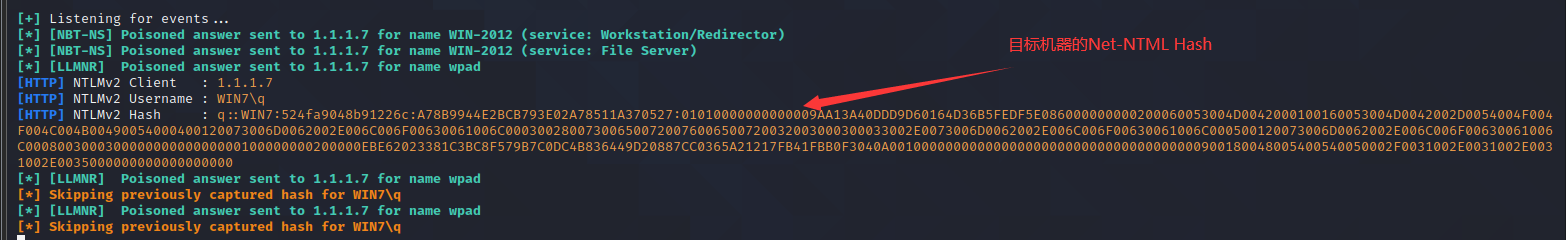 Net-NTLM Hash是指在网络环境中经过NTLM认证的散列值。挑战/响应验证中的“响应”就包含Net-NTLM Hash。使用Responder抓取的通常就是Net-NTLM Hash。攻击者无法使用该散列值进行哈希传递攻击,只能在使用Hashcat等工具得到明文后进行横向移动攻击。