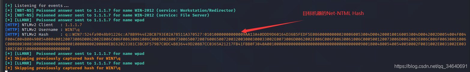 在渗透测试中,使用Responder 开启回应请求功能,Responuer会自动回应客户端的请求并声明自己就是被输人了错误计算机名的那台机器,然石尝试建立SMB连接。客户端项发送自已的Nt-NTeLM Hash进行身份验证,此时将得到目标机器的Net-NTLM Hash