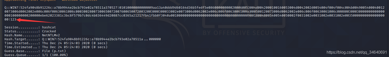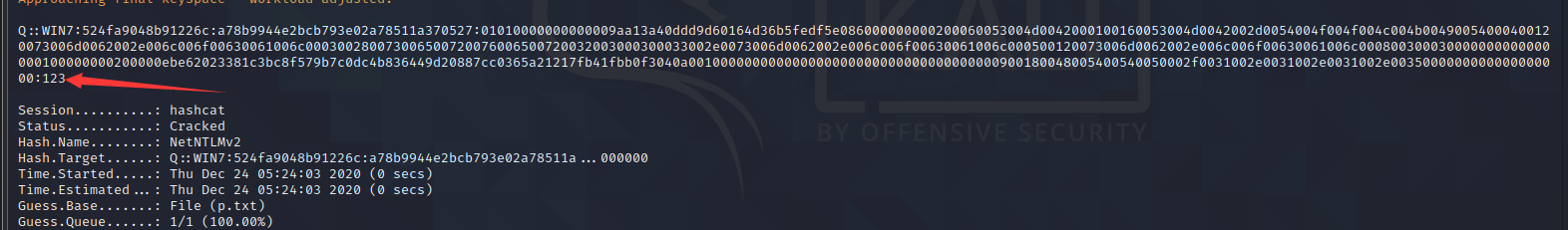hashcat -m 5600 q::WIN7:524fa9048b91226c:A78B9944E2BCB793E02A78511A370527:01010000000000009AA13A40DDD9D60164D36B5FEDF5E086000000000200060053004D0042000100160053004D0042002D0054004F004F004C004B00490054000400120073006D0062002E006C006F00630061006C000300280073006500720076006500720032003000300033002E0073006D0062002E006C006F00630061006C000500120073006D0062002E006C006F00630061006C000800300030000000000000000100000000200000EBE62023381C3BC8F579B7C0DC4B836449D20887CC0365A21217FB41FBB0F3040A001000000000000000000000000000000000000900180048005400540050002F0031002E0031002E0031002E0035000000000000000000 p.txt