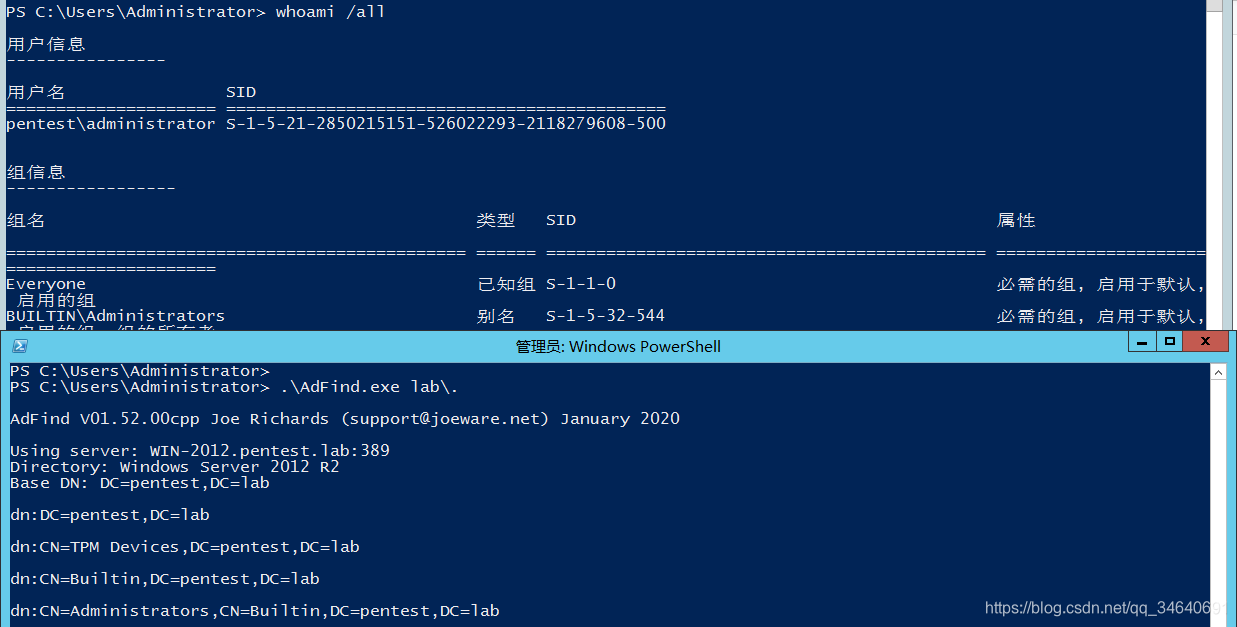 在本实验中,使用adfind 工具获取信任域的完整信息。下面以获取Administrator用户的详细信息