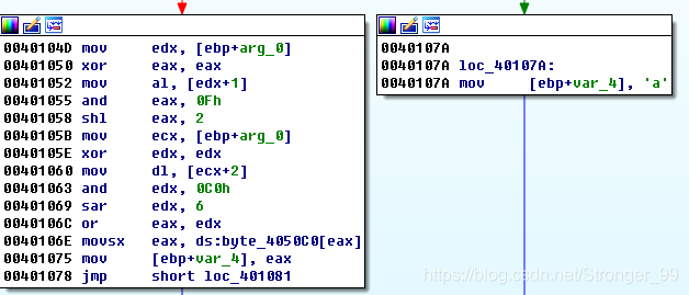 通过这段代码分析就可以知道aHttpWww_practi字符串上方push入栈的就是%c的内容,也就是函数sub_4011A3的参数。继续上方紧挨着的就是%s的内容。