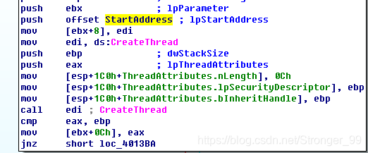 调用了函数CreateThread,用于创建一个线程,参数lpStartAddress被标记为了StartAddress,也就是线程开始的地址,向下看: