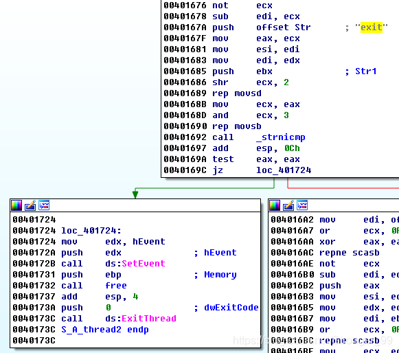 在S_A_thread2中可以看到,如果接受到了exit,就会调用函数ExitThread来退出当前的线程。返回之后可以看到程序会调用函数sub_401880: