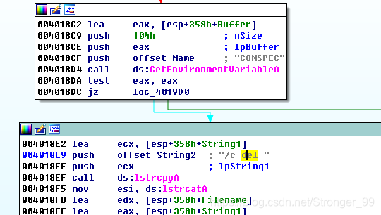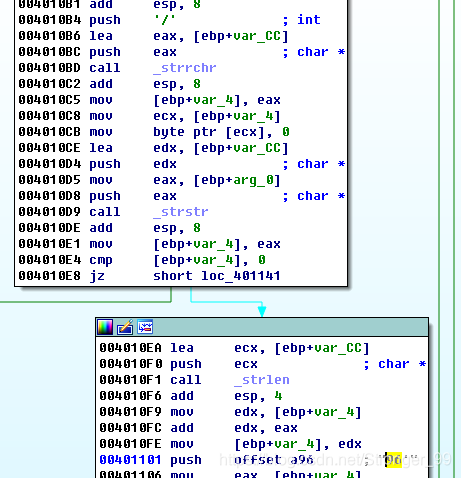这里调用了函数_strtok,选择函数,并将命令的内容分为两个部分,保存在两个变量里。继续向下看可以知道恶意程序中必须有一个noscript的标签,后面会跟随一个ULR,这里包含的域名和原始网页请求的域名相同,并且要求是以96位结尾。包含的命令的第一个字符必须和程序支持的命令相对应。当搜索noscript标签时,会先搜索<no,然后通过比较来确定noscript标签,当命令匹配时,程序仅仅会考虑第一个字符,这就会对我们的分析早成一定的困扰。