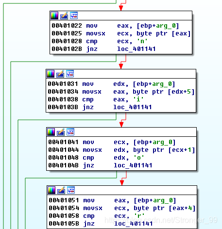 这个函数的目的就是搜索一个字符串在另一个字符串中第一次出现的位置,参数是<no,判断是否是<no开头,具体的判断内容在函数sub_401000中,进去看一下: