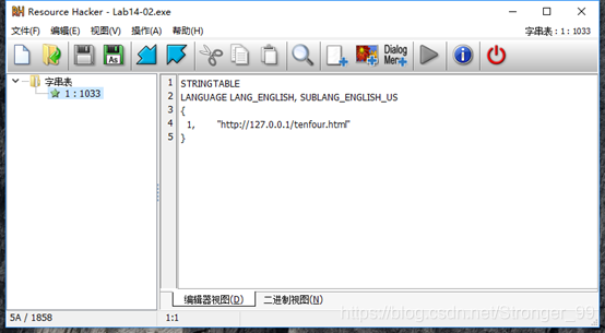 因为Internet1属于StartAddress,而StartAddress的参数又取决于lpParameter,而它的内容又由LoadStringA决定。这个函数的目的就是从资源节中读取字符串。下面使用Resource Hacker来查看一下: