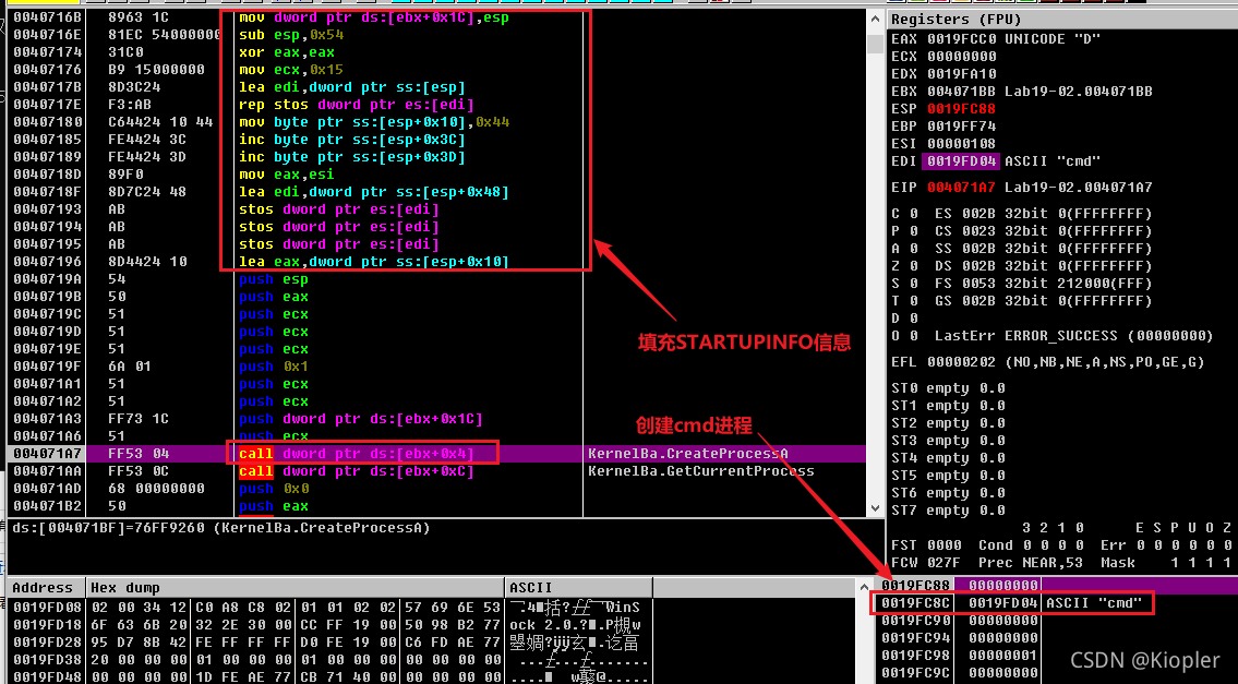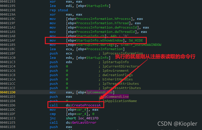 注意286处的call实际是调用CreateProcessA,这个文件名会被传递给CreateProcessA调用,它负责用刚刚写入磁盘的文件创建一个新进程
