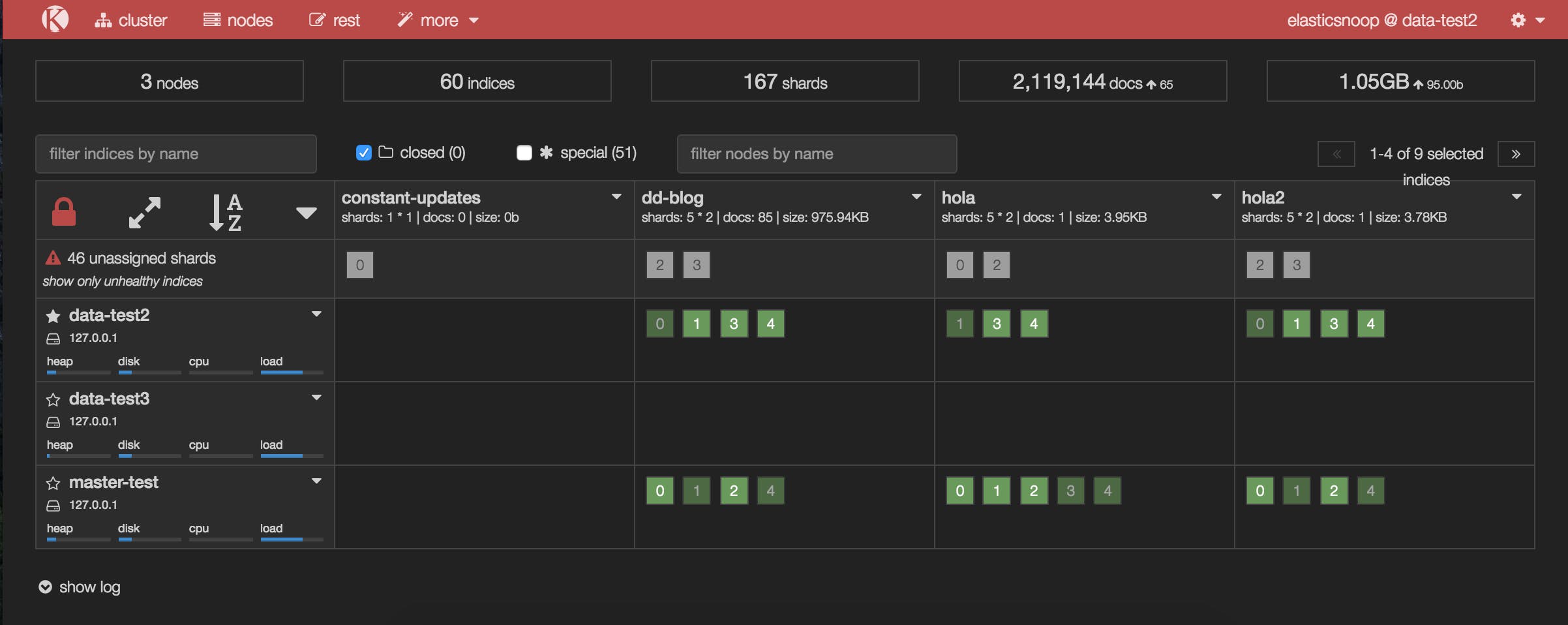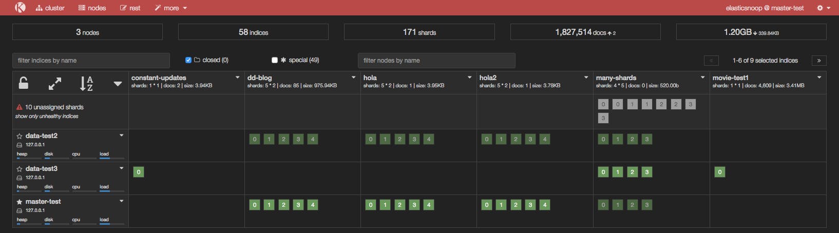 In the screenshot below, the many-shards index is stored on four primary shards and each primary has four replicas. Eight of the index’s 20 shards are unassigned because our cluster only contains three nodes. Two replicas of each primary shard haven’t been assigned because each of the three nodes already contains a copy of that shard.
