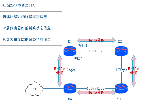 以R4为例,R4的链路状态通告应包含R4余该直连网络的链路信息、其邻居路由器R1和邻居路由器R3的链路状态信息。