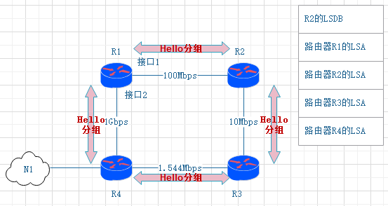 如上图,每个路由器之间互为邻居路由器,那么每个路由器都要向其他(N-1)个路由器发送问候分组和链路状态更新分组。