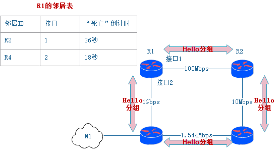 假设R1路由器的一张邻居表,R2是R1的一个邻居路由器,R1中的邻居ID就是R2来标识,R2连接到R1的接口1上,此时“死亡倒计时”还剩余36秒,弱在死亡倒计时到0之前收到来自R2的问候分组,则重新将R2对应的“死亡”倒计时置为40秒重新倒计时。否则,当死亡倒计时到达0时,则判定该邻居路由器不可达。