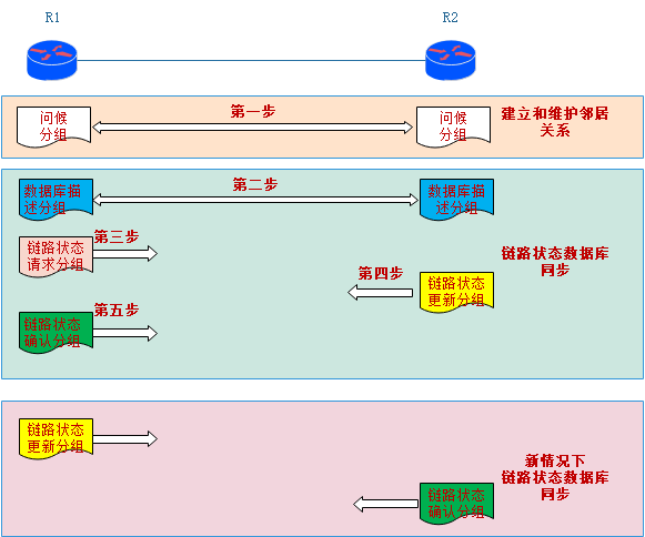 反之,R2也可以向R1发送链路状态请求分组,过程一样,最终R1和R2的链路状态数据库将达到一致,这就是链路状态数据库同步的过程。