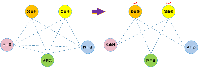 这样邻居关系数量大大减少。若DR出现问题,则有BDR顶替,实现DR和BDR的选举并不复杂,无非就是各路由器之间交互一些选举参数,例如路由器优先级、路由器ID、接口