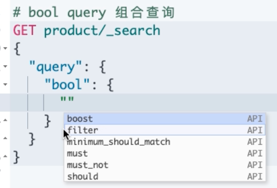 一个典型的使用场景是布尔查询 (bool), 它有两个重要的部分:must 和 filter。must 部分用于全文搜索,filter 部分用于过滤结果。看一个例子: