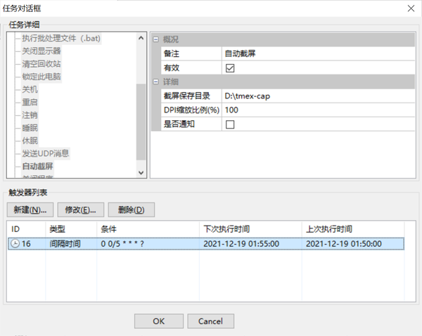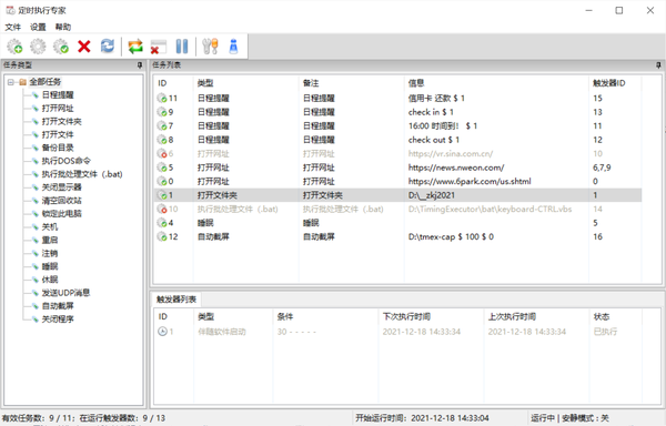 用户可以选择要运行的各种任务类型,并指定不同的触发方式,软件支持的任务类型和触发方式如下: