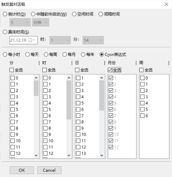 1) 倒计时;2) 随软件启动;3) 空闲时间; 4) 间隔时间;5) 具体时间;6) 每小时;7) 每天;8) 每周;9) 每月;10) 每年;11) Cron方式(Cron界面化设置方式,易于使用,可自行百度Cron表达式了解)