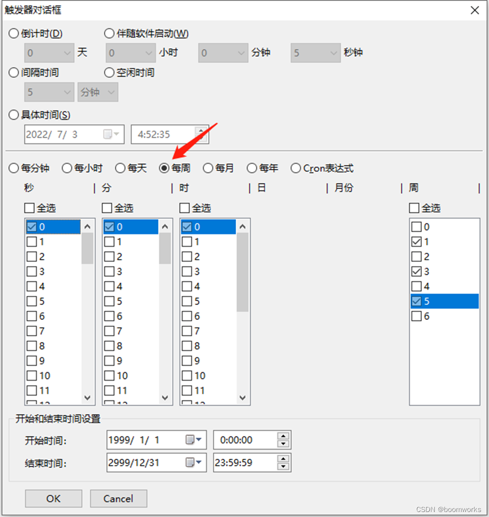 - 在 “触发器对话框” 选择 “每周”的 1、3、5(分别对应周一、三、五),在 “时” 列表框选择 0,“分” 列表框选择 0,在“秒”列表框选择 0(图5-16);