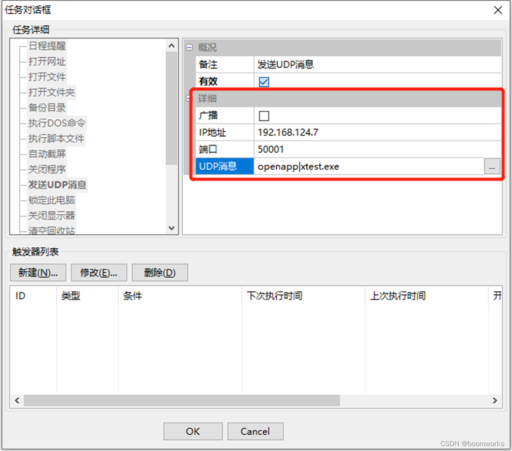 - 在 “任务对话框” 的 “任务详细” 左侧列表框选择 “发送UDP消息”,在右侧填写备注、IP地址、端口、UDP消息;