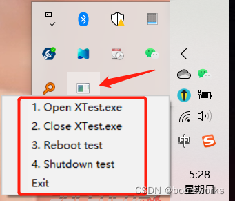 - 重启电脑,确认重启之后任务栏托盘有图5-14-6 显示的TinyExec.exe 图标(有图标出现即表示设置成功)。可在图标上点击右键,确认是否有菜单弹出。