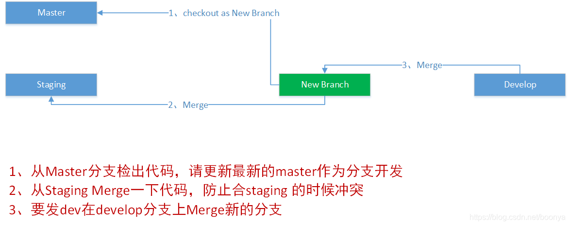 注:为了代码不与主干冲突,每个分支checkout master分支之后需要merge一次staging,这样在项目上线前不会发生大的冲突。