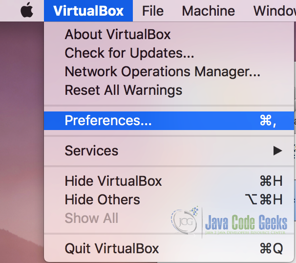 1.转到Virtualbox首选项菜单,并从下拉菜单中选择“首选项”(‘Preferences’)。