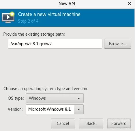 选择路径,这里是选择已有的win8.1.qcow2,选择操作系统类型记得选择Windows,版本选择windows 8.1