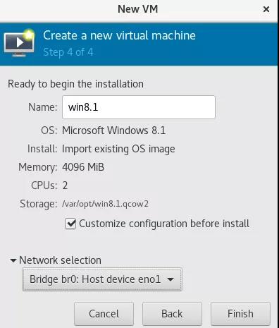 设置名字、还有设置网络(这里选择桥接br0,此前有文章介绍如何配置桥接)。如有必要可勾选"Customize configuration before install",以根据自己的需求配置虚拟硬件。