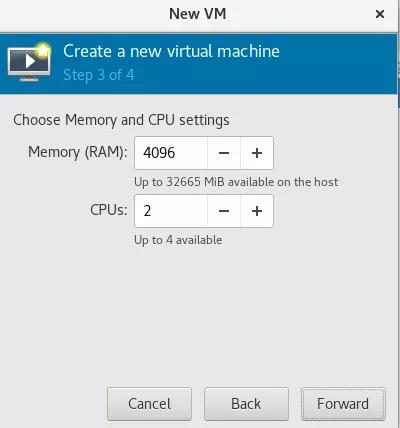 设置内存为4G、CPU为2(根据实际资源和需要而定):