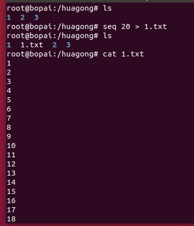 格式:seq 序数 例:打印20行序列到1.txt