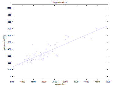 例:上次课的例子中,用x1表示房间大小。通过线性回归,在横轴为房间大小,纵轴为价格的图中,画出拟合曲线。回归的曲线方程为: